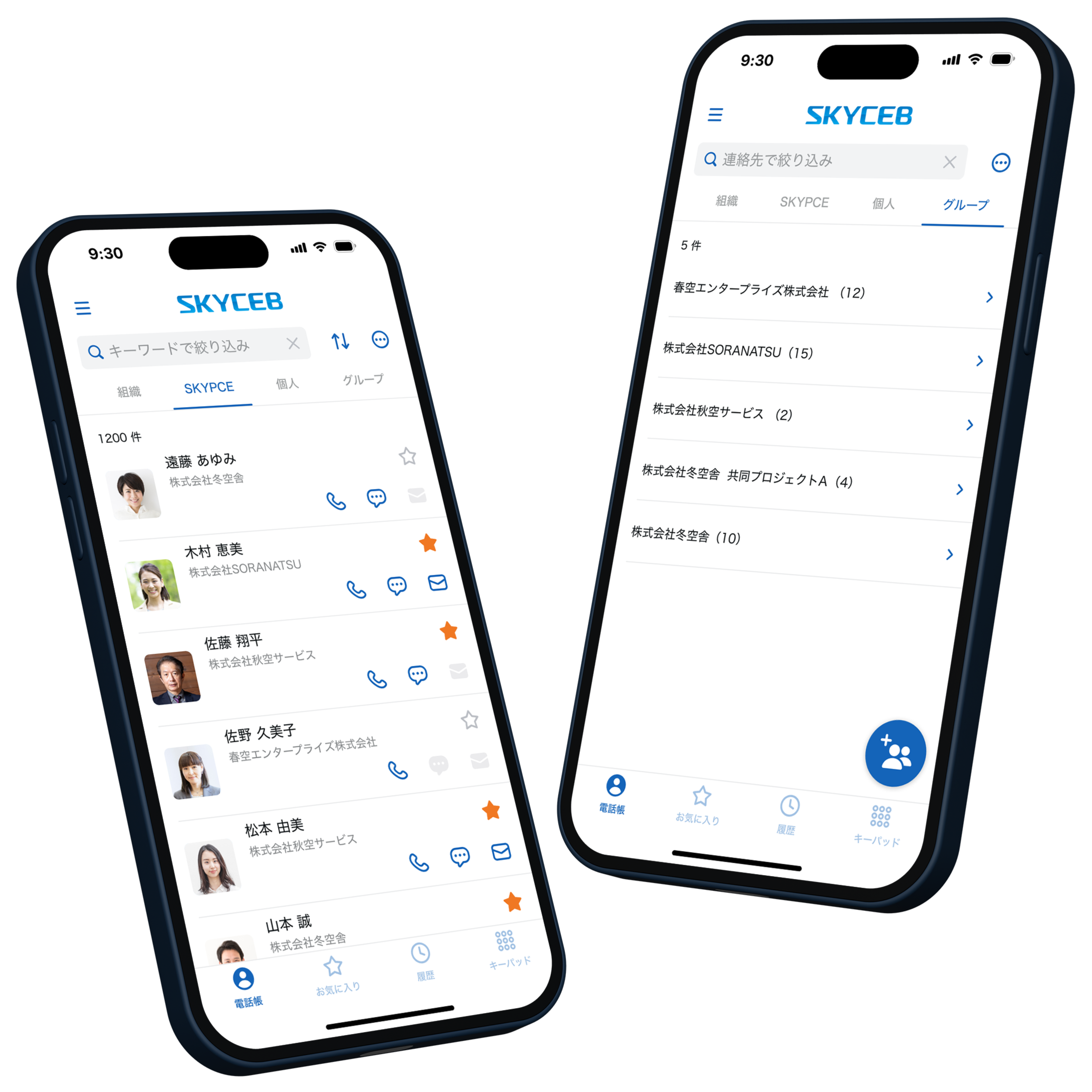 組織で共有する電話帳や、個人登録している電話帳とともに、SKYPCEで登録している名刺情報の連絡先を一括でスマートに管理・活用できます。
