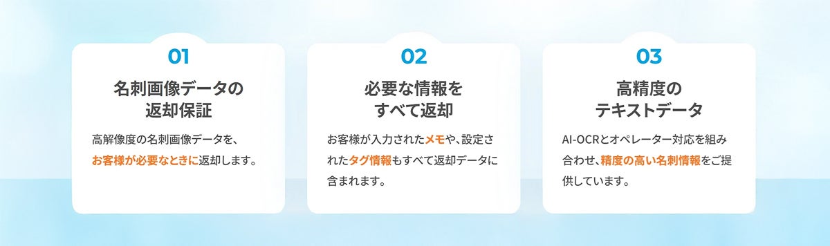 ご要望があれば、作業費は有償となりますが、高解像度の名刺画像を含むこれらすべてのデータを、いつでも責任を持って返却いたします。