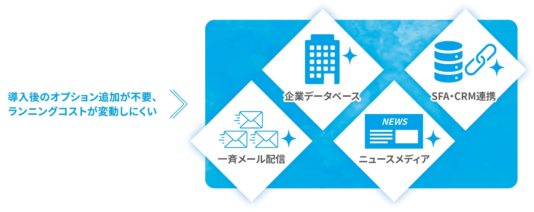 名刺管理サービスで集約される名刺データは、営業活動を効率的に行う上で大きな役割を果たす、組織の重要な資産です。しかし、名刺管理を目的にサービスを導入し、その後営業活動にも活用したくなったときに、オプション機能の追加購入が必要になるようでは、追加コストを懸念して導入に踏み切れないケースも。 SKYPCEでは、営業履歴を記録する機能や一斉メール配信機能、企業データベース、ニュースメディア連携機能、SFA・CRM連携機能など、名刺情報を営業活動にフル活用できる各種支援機能を“標準搭載”しています。営業活用がいつでもスタートできる体制を、導入時点で整備しておくことが可能です。
