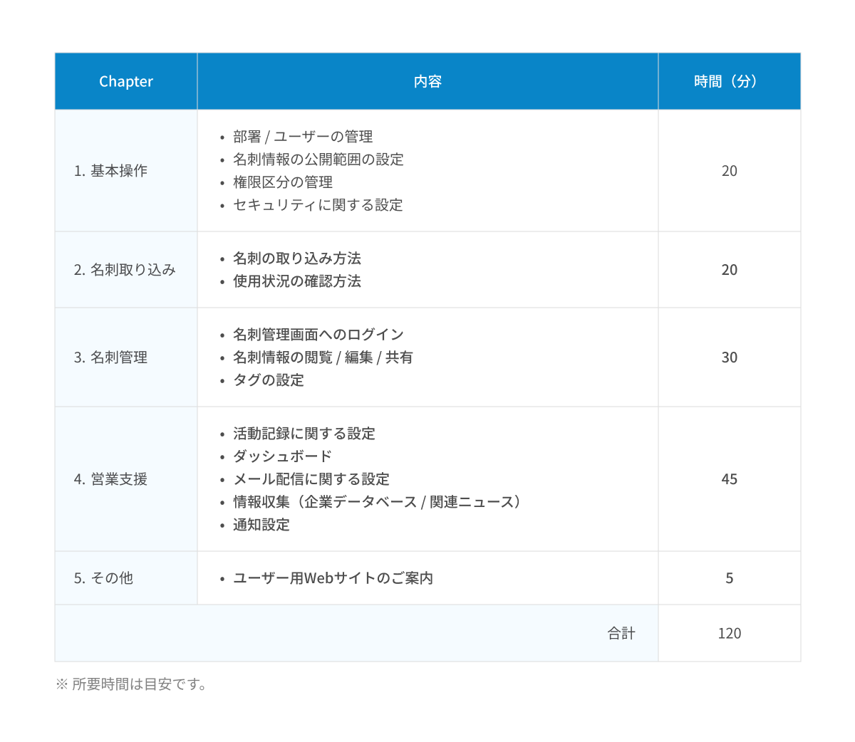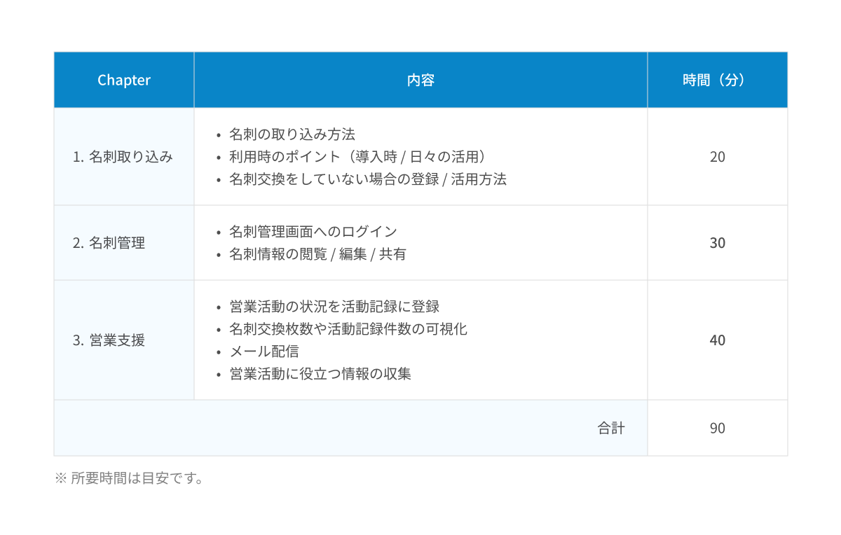 管理者向けの講習では、組織の運用方針に合わせて、部署・ユーザーの管理や名刺情報の公開範囲の設定など、基本操作から解説。講習内容についてご要望があれば、オンラインで事前に打ち合わせを行うことも可能です。また、利用者向けの講習では、実際の営業活動における利用シーンに沿ってポイントや操作方法を解説。初めて「SKYPCE」を利用される方でも、安心して効果的に活用できるようにサポートいたします。