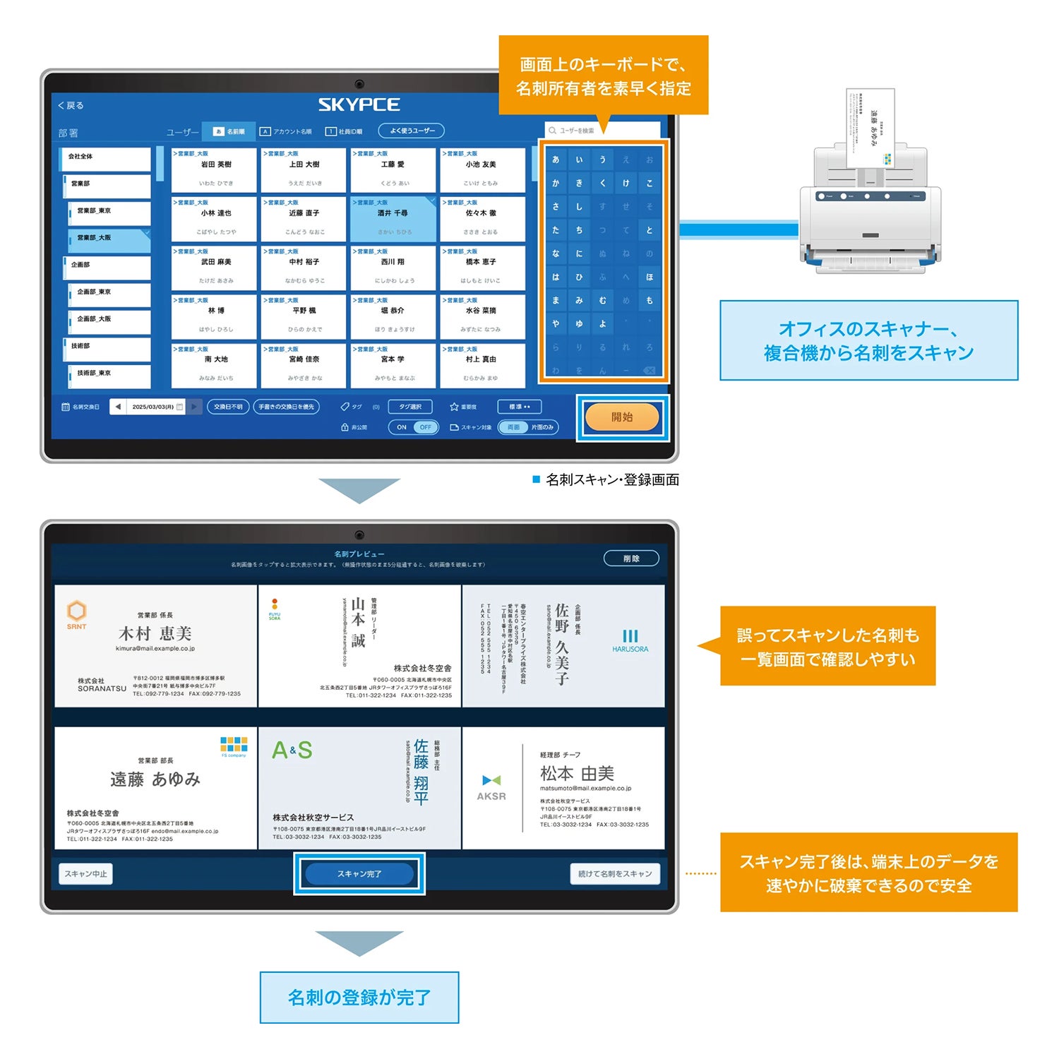 「SKYPCE」では、スキャナーや複合機に名刺をセットした上で、タブレット端末の画面上のキーボードで名刺所有者を素早く指定し、スキャンを実行します。この際、自動的に名刺プレビュー画面が表示され、登録する名刺画像が一覧で表示されるため、誤ってスキャンしてしまった名刺がないかを最後にもう一度確認することができます。