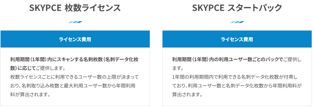 名刺管理サービスSKYPCEのライセンス体系について解説します。SKYPCEは、利用規模に合わせて選択できる「枚数ライセンス」と「スタートパック」の2種類のシンプルな料金体系が特徴です。また、導入初期に大量の名刺を取り込みたい方向けの「初期名刺取り込み放題」メニューも用意されています。