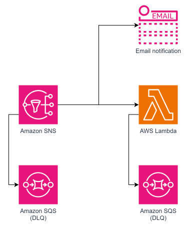 下記システム構成図のように、 Amazon SNS と AWS Lambda にデッドレターキュー(DLQ)を設定することができます。