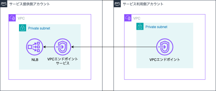 サービス利用側アカウントからの通信は、まずVPCエンドポイントを経由してAWSのプライベートなネットワークに入ります。