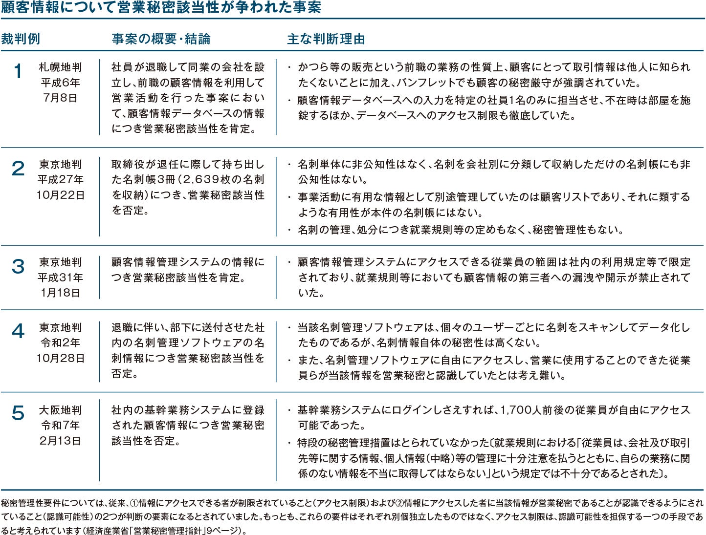 名刺データに限らず、顧客情報について営業秘密該当性が争われた事案は多数存在するところ、例えば下記の事案では次のような点が 注目されました。