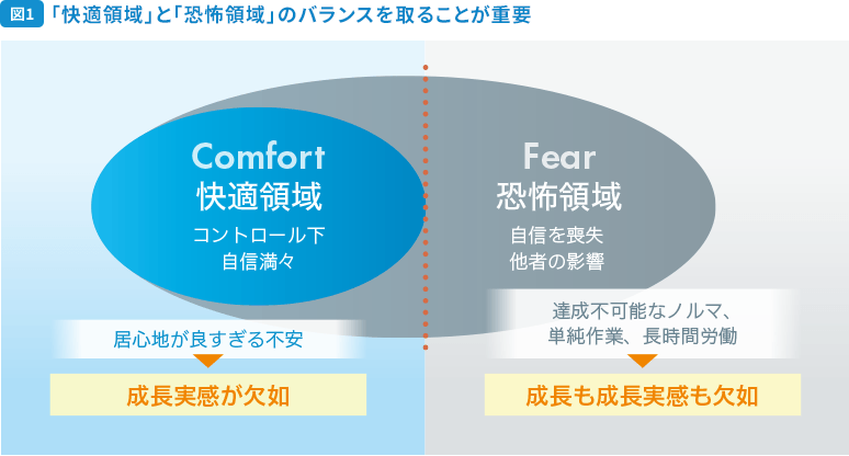 加えて働き方改革の影響もあり、転勤による新たな視点を獲得する機会も少なくなり、社員は居心地が良い「快適領域」にとどまろうとし、新たな挑戦への意欲が薄れがちになっています。こうした状況を打開するには、「恐怖領域」に飛び出す「越境」の機会を意識的に設けることが重要です。
