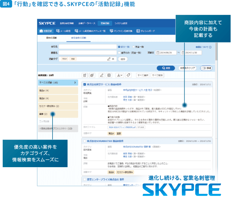 SKYPCEを活用すれば、商談内容や名刺交換の履歴などを通じて、顧客との関係性を確認しやすくなると思います。「活動記録」機能も、営業担当者の行動を記録するために非常に使いやすいと感じます。