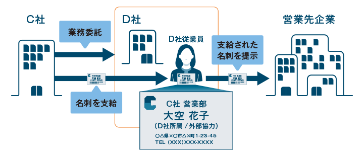 事務用品メーカーC社は、営業戦略の見直しを行い、取引先との関係構築・強化のため、営業活動のコンサルティングやサポートを行うD社と業務委託契約を締結しました。C社がD社に対して委託する業務の中には、D社の従業員がC社の営業活動を行うことも含まれており、C社はD社の従業員がC社の営業活動を対外的に行う際には、C社の従業員と同一の名刺を支給したいと考えています。このような行為は法的に問題になるのでしょうか。