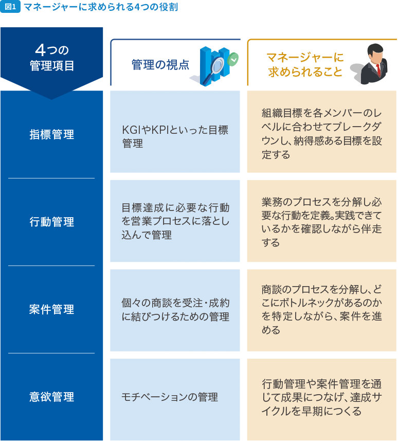 組織目標をメンバー一人ひとりのレベルに落とし込み(指標管理)、伴走しながら案件を進めて成果を出し(行動管理、案件管理)、その達成体験から意欲を高める(意欲管理)。私は、この循環をどう早く、どう確実に回せるかが、マネジメントの本質だと考えています。