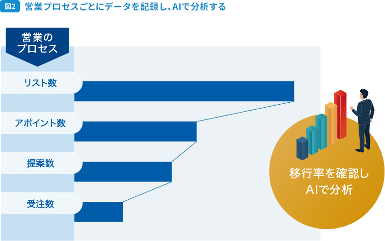 ただ、営業プロセスを7つまで細分化することが難しい場合もあるかもしれません。その場合は、もっと簡単に「①顧客リスト作成 → ②アポイント → ③提案 → ④受注」というプロセスに分解し、リスト数からアポイント数、提案数、受注数までの移行率を記録していきます。図2
