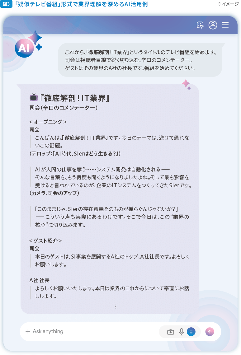 そのほかにも、初めての業界にアプローチするときは、AIにその業界の内情を深掘りするような「疑似テレビ番組」を作ってもらうこともあります。