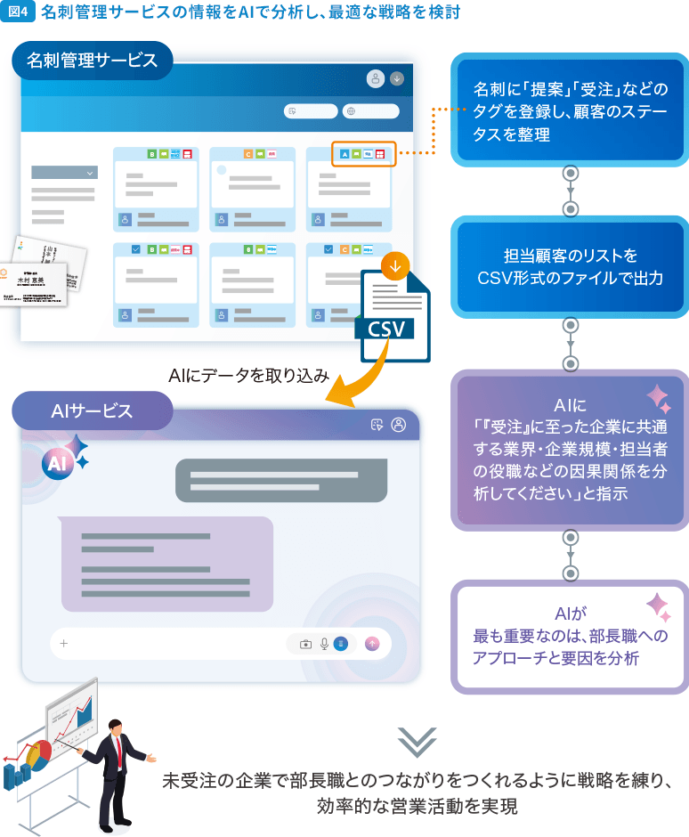 その上で、受注に至った企業にどのような共通点があるのかをAIに分析させると、「成果につながりやすい条件」が見えてきます。次に、その条件を基に、まだ受注できていない企業に対する戦略を考えることで、営業活動の精度を高められるのではないでしょうか。図4