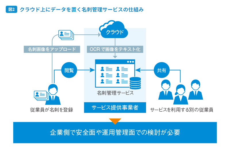従業員にとっては、手間のかかる名刺の登録作業を代行してもらえ、データがクラウドサーバー上にあることで時間や場所に拘束されず簡単に顧客情報を確認できるという点で便利なサービスだと思われます。一方、企業にとっては、大量の顧客情報を社外のクラウドサーバー上で管理することになるため、クラウドサーバーや通信経路の安全性やアクセス認証機能の適切性等の観点からの検証が必要となります。 図2